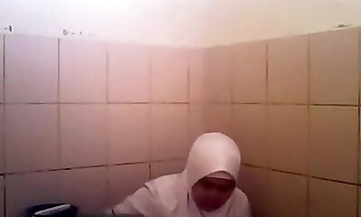 Arab woman goes pee in a public restroom