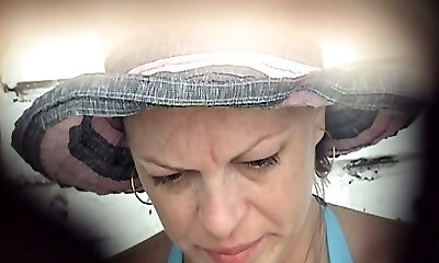 Mature milky lady in blue bikini urinates in the public toilet room on the beach