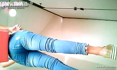 Sweet white booty of a stranger girl in blue denim filmed in the toilet