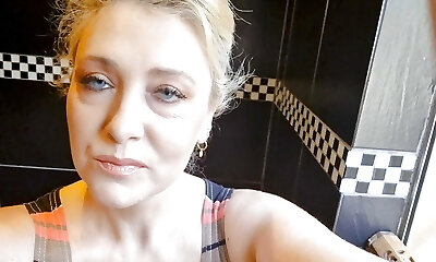 sissy chick changing into new pink panty and stockings in public toilet